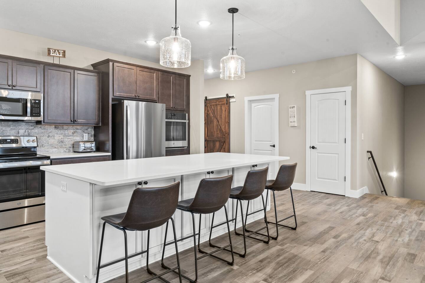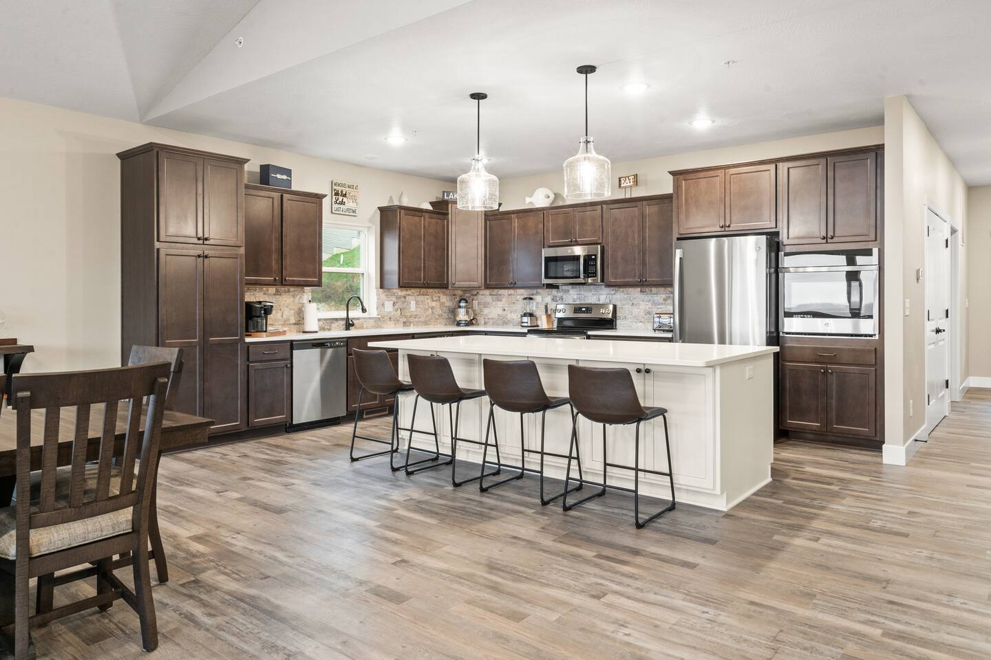 Upstairs, the gourmet kitchen is designed to impress. Rich dark cabinetry pairs beautifully with sleek white stone countertops and premium stainless-steel appliances, including double ovens that make cooking for a crowd effortless. Guests can gather around the spacious island for casual bites, while the dining table comfortably seats ten for memorable meals filled with laughter.
