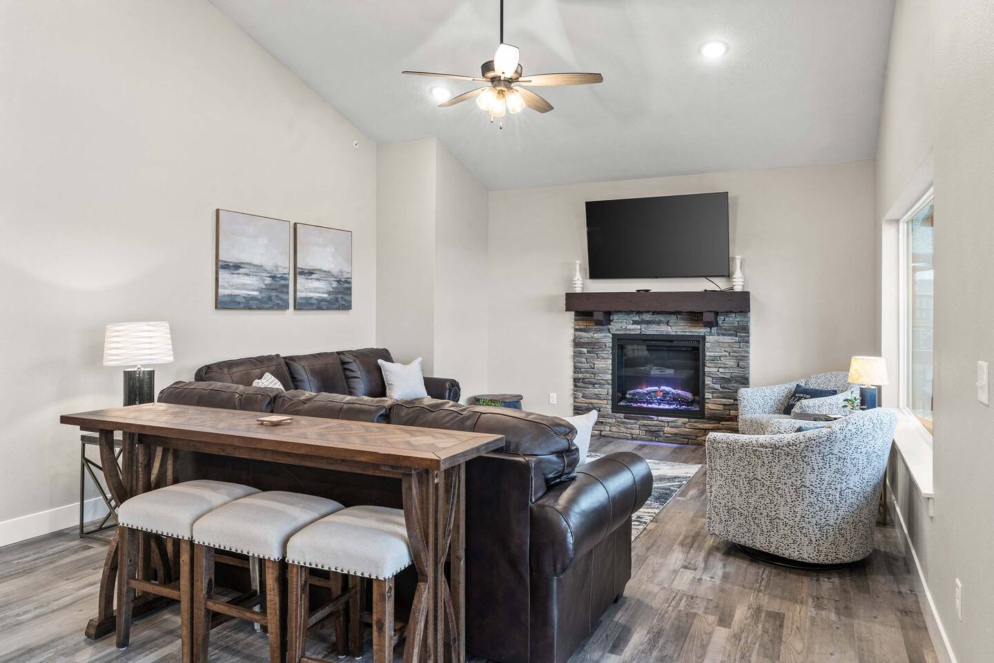 Step inside this expansive, lodge-inspired retreat where comfort meets elevated style. The main living area welcomes you with two plush sofas and cozy armchairs gathered around a fireplace and mounted TV—enjoy quiet evenings in. Downstairs, the game room becomes your private entertainment hub. Challenge friends to air hockey, relive the glory days of arcade gaming, or unwind in home-theater-style leather recliners - perfect for movie nights or watching the big game. A convenient wet bar with a Keurig/drip coffee combo, sink, and full-size refrigerator keeps snacks and drinks close at hand.