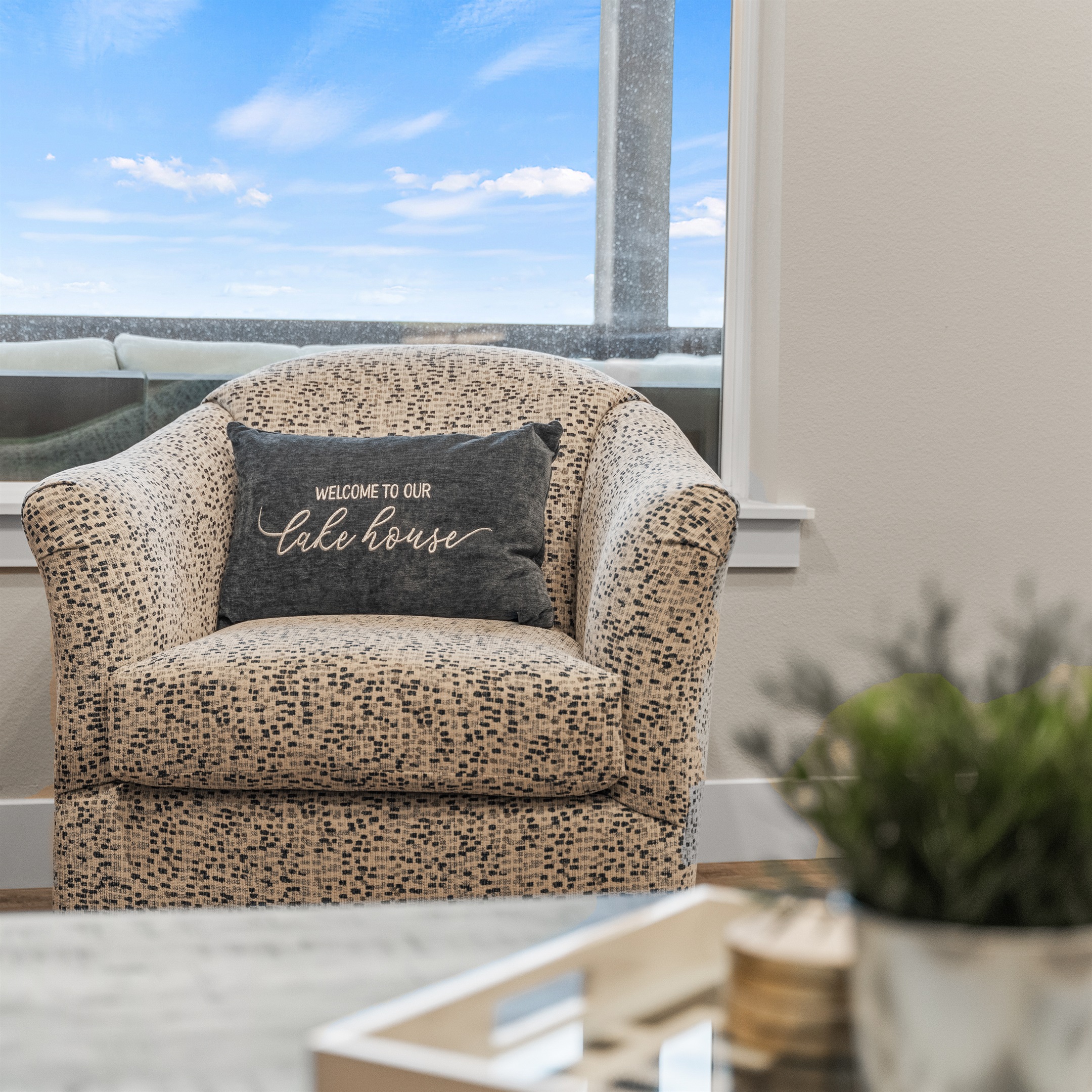 Step onto the upper-level deck and take in the lake breeze and sweeping views. This inviting outdoor space features a fireplace, TV, generous seating, and a table for six—ideal for relaxing evenings. (The charcoal grill is located at the front of the property, just to the right.) On the lower-level deck, you’ll find even more ways to unwind, including a seven-person hot tub, a convertible shuffleboard/dining table for eight, corn hole game and picturesque sunset views framed by the surrounding trees.