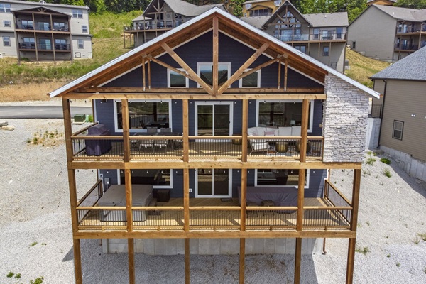 Upper deck sitting area seats eight, outdoor fireplace and TV